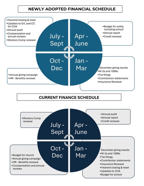 After careful consideration and prayerful deliberation, the Finance Team has been given authorization from the CLT to move our fiscal year-end from December 31 to June 30. This change will align the fiscal calendars of both our church and school, allowing us to operate more efficiently and effectively as one entity. The new fiscal year will begin on July 1.