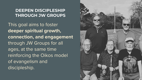 • Relaunch the JW Discipleship Pathway (three-stage discipleship pathway for members/guests (e.g., Connect → Grow → Activate).